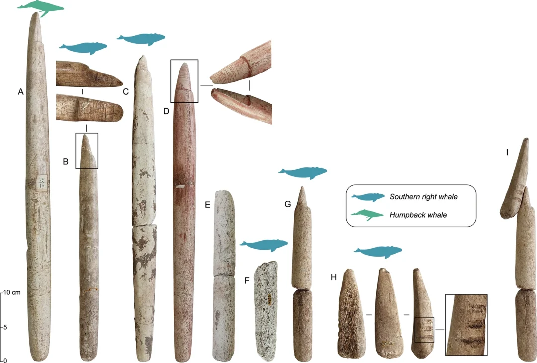 Sambaquis are ancient shell mounds built by coastal communities in southern Brazil, and they are famous for their large quantities of marine mammal bones. But until recently, the prevailing view held that whales were scavenged opportunistically, not hunted. That view is no longer tenable. Molecular analysis using ZooMS (Zooarchaeology by Mass Spectrometry) has confirmed the presence of worked and unworked bones from humpback whales, southern right whales, and even blue and sei whales. More strikingly, several bone harpoon foreshafts and socket pieces bear unmistakable hallmarks of active hunting technology. These bones have been radiocarbon dated to nearly 5000 years ago. They include beveled ends for hafting, grooves for securing barbs, and hollowed sockets for detachable points.