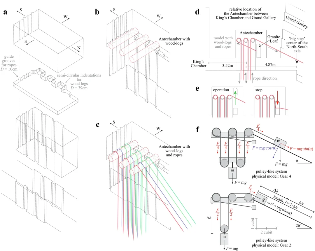 Scheuring presents the internal spaces as parts of a single lifting machine. The Grand Gallery becomes a sliding track. The Antechamber becomes a pulley like device. The Ascending Passage becomes a force transmission corridor. The vertical shafts become lifting conduits inside the model. It claims that this system could raise the sixty ton granite beams of the King’s Chamber by using multiple rope folds to divide the load. It also claims that the pyramid grew in vertical shafts and sliding ramp spurts. This staged growth is not supported by direct evidence and is introduced to support the mechanical idea.
