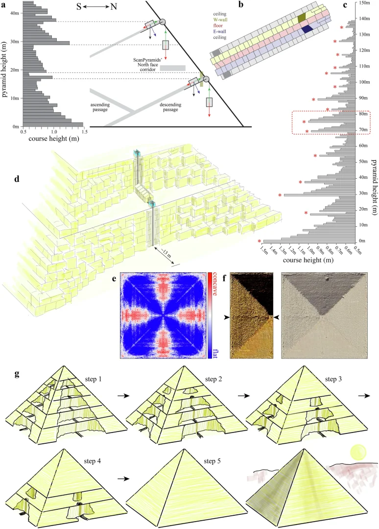 Jean Pierre Houdin’s work, developed over more than a decade and documented in several technical papers, presents a complete construction theory that joins architecture, engineering, logistics, and structural analysis. He proposes that the pyramid was built with an external ramp for the lower third and an internal ramp for the upper two thirds. The internal ramp spirals upward inside the pyramid and turns at a series of ninety degree staging chambers. One of these chambers was later rediscovered and is now known as “Bobs Room”. This ramp system explains the concavity of the pyramid faces. It also explains the microgravimetry anomalies, the pattern of internal voids, and the architectural inheritance from the pyramids of Sneferu.
