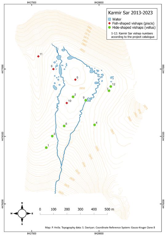 Map of Tirinkatar with location of vishaps; Pisces are marked red, Vellus are marked green (Map: P. Hnila, Topography data: S. Davtyan). Source: https://doi.org/10.1038/s40494-025-01998-z CC BY-NC-ND 4.0