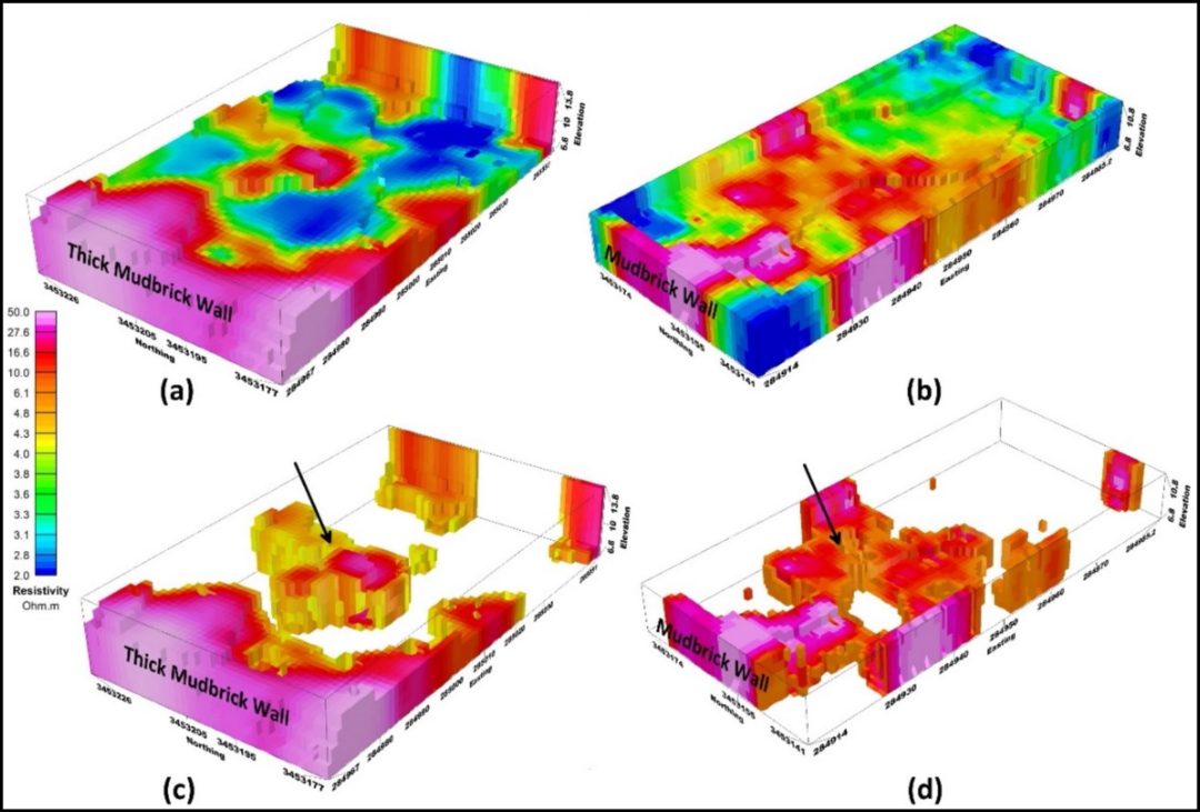 Quasi-3D resistivity volume generated by the post-processing combination of the inverted resistivity data from a nine 2D ERT sections in Area A and b six 2D ERT sections in Area B. c and d present a 3D isometric view of the high-resistivity anomalies detected within the two investigated areas Image Source: https://doi.org/10.1007/s11600-026-01809-4