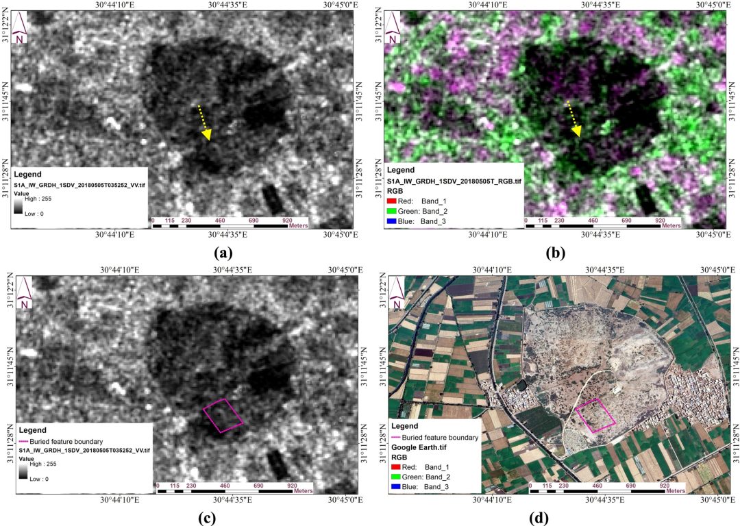 Discovered feature based on Sentinel-1 (C-band) imagery: a the Sentinel-1 data show the buried feature; b an RGB image shows the buried feature; c the buried feature surrounded by a red line; d the location of the buried remains is shown by the Google Earth image. Image Source: https://doi.org/10.1007/s11600-026-01809-4
